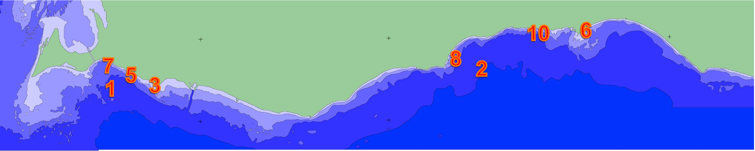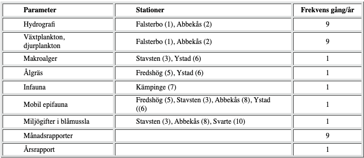Provtagningsprogrammet kommer för år 2026 att ske i följande omfattning vad gäller provtagning, analys, redovisning och utvärdering av kemisk fysikaliska parametrar i vatten, växtplankton, djurplankton, bottenfauna, makroalger och ålgräsängar. Inom ålgräsprovtagningen och makroalger kommer djuputbredningen att dokumenteras i fortsättningen. Kartan visar provpunkternas (sifferkodade) placering längs kusten.